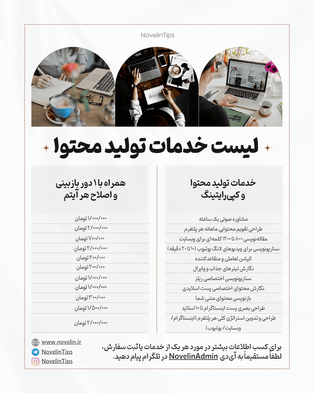 برای کسب اطلاعات بیشتر در مورد هر یک از خدمات یا ثبت سفارش، لطفاً مستقیماً به آی‌دی NovelinAdmin در تلگرام پیام دهید.